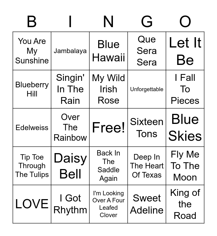This bingo card has a free space and 36 words: Folsom Prison Blues, Pistol Packin' Mama, Crazy, Singin' In The Rain, Deep In The Heart Of Texas, Tip Toe Through The Tulips, My Wild Irish Rose, Hello Dolly, Let It Be, Moon River, Over The Rainbow, Que Sera Sera, Hound Dog, Sixteen Tons, I Fall To Pieces, You Are My Sunshine, Don't Fence Me In, Daisy Bell, King of the Road, Blue Hawaii, Blue Skies, Fly Me To The Moon, I Got Rhythm, LOVE, I'm Looking Over A Four Leafed Clover, Jambalaya, Edelweiss, Rockin' Robin, Unforgettable, Blueberry Hill, All of Me, A Bushel and a Peck, Sweet Adeline, Back In The Saddle Again, Happy Trails and I Walk The Line.