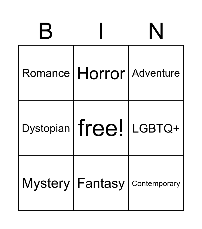 This bingo card has a free space and 10 words: Fantasy, Adventure, Romance, Contemporary, Dystopian, Mystery, Horror, Thriller, LGBTQ+ and Paranormal.