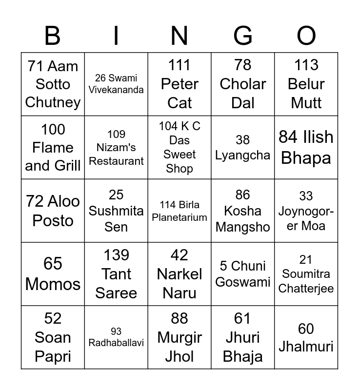 This bingo card has 144 words: Free!, 1 Abhijit Banerjee, 2 Anjan Rakshit, 3 Ashok Kumar, 4 Bappi Lahiri, 5 Chuni Goswami, 6 Jyoti Basu, 7 Kishore Kumar, 8 Kumar Sanu, 9 Leander Paes, 10 Mamata Banerjee, 11 Mithun Chakraborty, 12 Mother Teresa, 13 Rabindra Tagore, 14 Ravi Shankar, 15 Rituparno Ghosh, 16 Robi Ghosh, 17 Satyajit Ray, 18 Shaan, 19 Sharmila Tagore, 20 Shreya Ghosal, 21 Soumitra Chatterjee, 22 Sourav Ganguly, 23 Subhash Chandra Bose, 24 Suchitra Sen, 25 Sushmita Sen, 26 Swami Vivekananda, 27 Swapna Rakshit, 28 Usha Uthup, 29 Utpal Dutt, 30 Uttam Kumar, 31 Goja, 32 Jhilipi, 33 Joynogor-er Moa, 34 Kaju Barfi, 35 Kalojam, 36 Kheer Kadam, 37 Ledikeni, 38 Lyangcha, 39 Malai Chom Chom, 40 Malpua, 41 Mishti Doi, 42 Narkel Naru, 43 Nolen Gurer Payesh, 44 Pantua, 45 Patishapta, 46 Rabri, 47 Raj Bhog, 48 Roshogolla, 49 Roshomalai, 50 Sandesh, 51 Shor Bhaja, 52 Soan Papri, 53 Aloo Kabli, 54 Batata Puri, 55 Bhel Puri, 56 Chanachur, 57 Churmur, 58 Egg Roll, 59 Fish Cutlet, 60 Jhalmuri, 61 Jhuri Bhaja, 62 Khasta Kochuri, 63 Kobiraji Cutlet, 64 Luchi & Alu Dom, 65 Momos, 66 Mughlai Paratha, 67 Mutton Chop, 68 Nimki, 69 Phuchka, 70 Phulkopir Shingara, 71 Aam Sotto Chutney, 72 Aloo Posto, 73 Begun Bhajja, 74 Beguni, 75 Bhetki Butter Fry, 76 Chingri Malaikari, 77 Chirer Polao, 78 Cholar Dal, 79 Daab Chingri, 80 Dhokar Dalna, 81 Doi Ilish, 82 Egg Devil, 83 Ilish Bhaja, 84 Ilish Bhapa, 85 Khichuri, 86 Kosha Mangsho, 87 Lau Ghonto, 88 Murgir Jhol, 89 Muri Ghonto, 90 Mutton Biryani, 91 Plastic Chutney, 92 Potoler Dolma, 93 Radhaballavi, 94 Rui Kalia, 95 Shorshe Ilish, 96 Shukto, 97 6 Ballygunge Place, 98 Barbeque Nation, 99 Bijoli Grill, 100 Flame and Grill, 101 Floatel, 102 Flury's Bakery, 103 Ganguram Sweet Shop, 104 K C Das Sweet Shop, 105 Kathleen, 106 Kwality Restaurant, 107 Mainland China, 108 Monginis, 109 Nizam's Restaurant, 110 Oh! Calcutta, 111 Peter Cat, 112 Alipore Zoo, 113 Belur Mutt, 114 Birla Planetarium, 115 Dakshineswar, 116 Eden Gardens, 117 Fort William, 118 Howrah Bridge, 119 Kalighat Temple, 120 Maidan, 121 Netaji Indoor Stadium, 122 Park Street, 123 Salt Lake Stadium, 124 St. Paul's Cathedral, 125 Victoria Memorial, 126 Bhai Phonta, 127 Durga Puja, 128 Janmashtami, 129 Kali Puja, 130 Lakshmi Puja, 131 Mahalaya, 132 Poila Boishakh, 133 Rakhi Bandhan, 134 Saraswati Puja, 135 Banarasi Saree, 136 Bishnupuri Silk Saree, 137 Kantha Stitch Saree, 138 Tangail Saree, 139 Tant Saree, 140 Tussar Silk Saree, 141 Dhoti, 142 Kurta and 143 Kolhapuri Sandal.