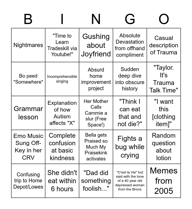 This bingo card has a free space and 24 words: Complete confusion at basic kindness, She didn't eat within 6 hours, Absurd home improvement project, Confusing trip to Home Depot/Lowes, Casual description of Trauma, Nightmares, Bo peed *Somewhere*, "Time to Learn Tradeskill via Youtube!", "Think I can eat that and not die?", Bella gets Praised so Much My Praisekink activates, Sudden deep dive into obscure history, Grammar lesson, Fights a bug while crying, Random question about lotion, Incomprehensible singing, "C'est la Vie" but said with the tone of a 40 year old depressed woman from the Bronx, "I want this [clothing item]", Gushing about Joyfriend, "Taylor. It's Trauma Talk Time", Explanation of how Autism affects "X", Memes from 2005, Emo Music Sung Off-Key in her CRV, Absolute Devastation from offhand compliment and "Dad did something foolish...".
