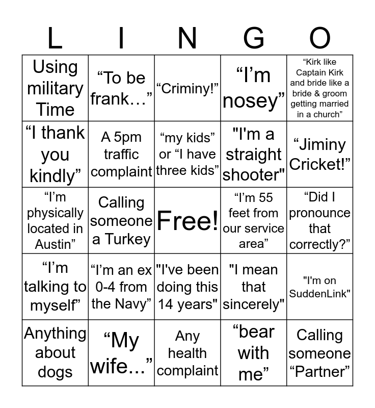 This bingo card has a free space and 24 words: “I’m an ex 0-4 from the Navy”, “My wife...”, “my kids” or “I have three kids”, Anything about dogs, “Kirk like Captain Kirk and bride like a bride & groom getting married in a church”, Using military Time, “I thank you kindly”, “To be frank…”, “I’m 55 feet from our service area”, "I've been doing this 14 years", "I'm a straight shooter", “I’m physically located in Austin”, "I mean that sincerely", "I'm on SuddenLink", A 5pm traffic complaint, “bear with me”, “Did I pronounce that correctly?”, “Criminy!”, “Jiminy Cricket!”, Calling someone a Turkey, Calling someone “Partner”, “I’m talking to myself”, “I’m nosey” and Any health complaint.