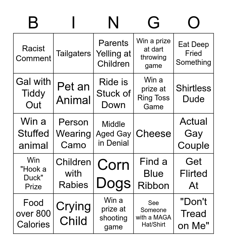 This bingo card has a free space and 24 words: Children with Rabies, Crying Child, Ride is Stuck of Down, Food over 800 Calories, Eat Deep Fried Something, Racist Comment, Gal with Tiddy Out, Tailgaters, Cheese, Corn Dogs, Win a prize at Ring Toss Game, Win a Stuffed animal, Find a Blue Ribbon, Get Flirted At, Pet an Animal, See Someone with a MAGA Hat/Shirt, Actual Gay Couple, Parents Yelling at Children, Shirtless Dude, Person Wearing Camo, "Don't Tread on Me", Win "Hook a Duck" Prize, Win a prize at dart throwing game and Win a prize at shooting game.