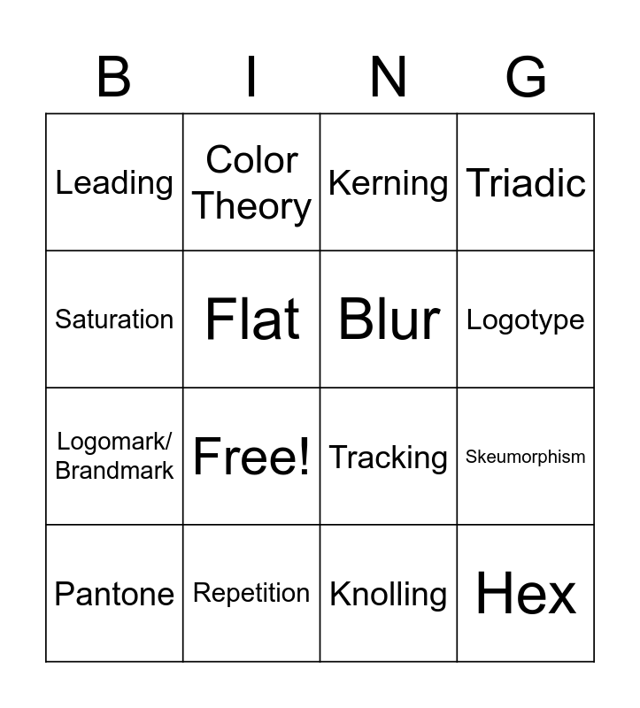 This bingo card has 18 words: Free!, Hex, Kerning, Leading, Tracking, Triadic, Pantone, Color Theory, Logotype, Logomark/ Brandmark, Knolling, Saturation, Skeumorphism, Flat, Blur, Radial, Repetition and Hierarchy.