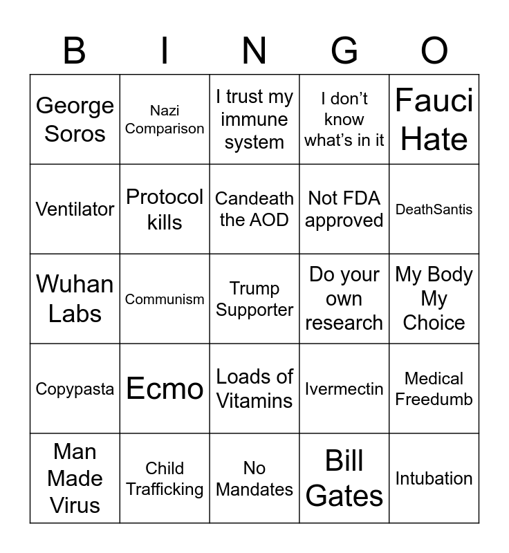 This bingo card has a free space and 24 words: Ecmo, Child Trafficking, Candeath the AOD, Man Made Virus, Fauci Hate, George Soros, Ventilator, Nazi Comparison, Do your own research, Loads of Vitamins, Not FDA approved, Wuhan Labs, Ivermectin, Medical Freedumb, Protocol kills, Bill Gates, My Body My Choice, I trust my immune system, DeathSantis, Communism, Intubation, Copypasta, I don’t know what’s in it and No Mandates.
