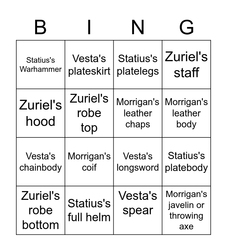 This bingo card has 16 words: Statius's full helm, Statius's platebody, Statius's platelegs, Statius's Warhammer, Vesta's chainbody, Vesta's plateskirt, Vesta's longsword, Vesta's spear, Zuriel's hood, Zuriel's robe top, Zuriel's robe bottom, Zuriel's staff, Morrigan's coif, Morrigan's leather body, Morrigan's leather chaps and Morrigan's javelin or throwing axe.