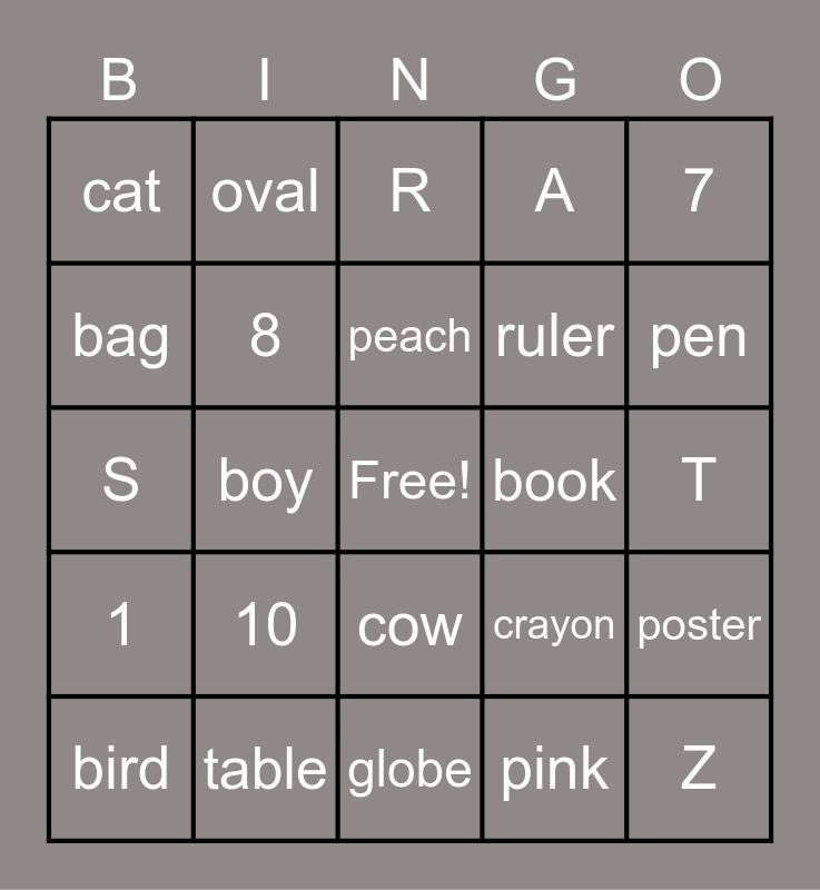 This bingo card has a free space and 24 words: bird, 10, peach, pink, 7, cat, oval, R, book, T, S, 8, crayon, poster, bag, table, globe, A, pen, 1, boy, cow, ruler and Z.