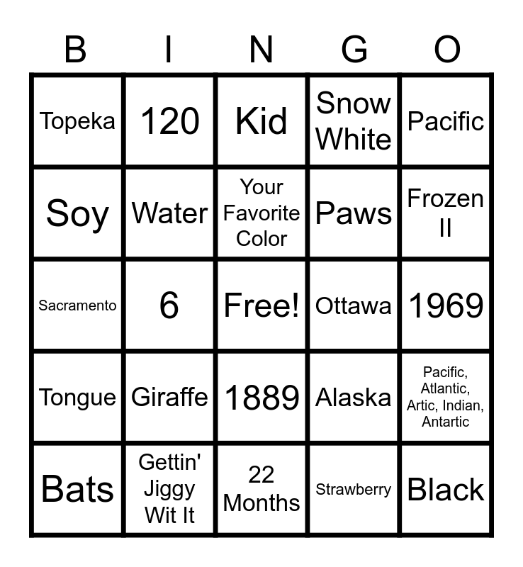 This bingo card has a free space and 24 words: Giraffe, Gettin' Jiggy Wit It, Your Favorite Color, Bats, Pacific, Topeka, Soy, 120, Ottawa, 1889, Paws, Sacramento, Alaska, Pacific, Atlantic, Artic, Indian, Antartic, Water, Strawberry, 1969, Kid, Frozen II, 6, Black, Tongue, Snow White and 22 Months.