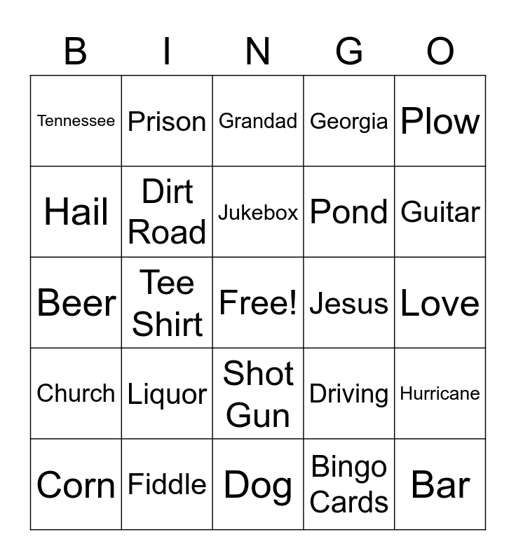 This bingo card has a free space and 80 words: Country, Bass, Grandad, Whiskey, Moonlight, Sunset, Cow, Pigs, Hay, Summer, Pole, Pickup, Georgia, Tennessee, Fair, Hail, God, Liquor, 6 string, Love, Girlfriend, Plow, Beer, Jukebox, Dirt Road, Hunting, River, Road, Muddy, Cowboy, Guitar, Heart Break, Dog, Sunshine, Corn, Jesus, Lake, Tornado, Daughter, Bar, Truck, Farmer, carolina, Drink, Barn, Prison, Rain, Deer, Blond, Evinrude, Hurricane, Tee Shirt, Driving, Field, Preacher, Pretty, Boat, Tractor, Long Hair, Shot Gun, Pond, Shot, Wine, Chicken, Broken Heart, Daughter, Buddies, Blue Gill, Cabin, County, Church, Fiddle, Bartender, Fishing, Pool, Bingo Card Generator, Bingo Cards, Help, Legal and Login/Sig.