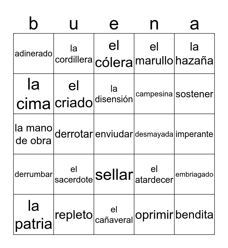 This bingo card has 27 words: el atardecer, bendita, campesina, el cañaveral, la cima, el cólera, la cordillera, derrumbar, desmayada, embriagado, la mano de obra, el marullo, la patria, repleto, sostener, vigilar, el criado, la disensión, el sacerdote, adinerado, imperante, oprimir, derrotar, enviudar, sellar, la hazaña and la valentía.
