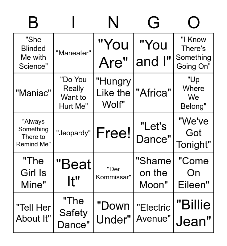 This bingo card has a free space and 50 words: "Every Breath You Take", "Billie Jean", "Flashdance... What a Feeling", "Down Under", "Beat It", "Total Eclipse of the Heart", "Maneater", "Baby, Come to Me", "Maniac", "Sweet Dreams (Are Made of This)", "Do You Really Want to Hurt Me", "You and I", "Come On Eileen", "Shame on the Moon", "She Works Hard for the Money", "Never Gonna Let You Go”, "Hungry Like the Wolf", "Let's Dance", "Twilight Zone", "I Know There's Something Going On", "Jeopardy", "Electric Avenue", "She Blinded Me with Science", "Africa", "Little Red Corvette", "Back on the Chain Gang", "Up Where We Belong", "Mr. Roboto", "You Are", "Der Kommissar", "Puttin' on the Ritz", "Sexual Healing", "(Keep Feeling) Fascination", "Time (Clock of the Heart)", "The Safety Dance", "Mickey", "You Can't Hurry Love, "Separate Ways (Worlds Apart)", "One on One", "We've Got Tonight", "1999", "Stray Cat Strut", "Allentown", "Stand Back", "Tell Her About It", "Always Something There to Remind Me", "Truly", "Dirty Laundry", "The Girl Is Mine" and "Too Shy".