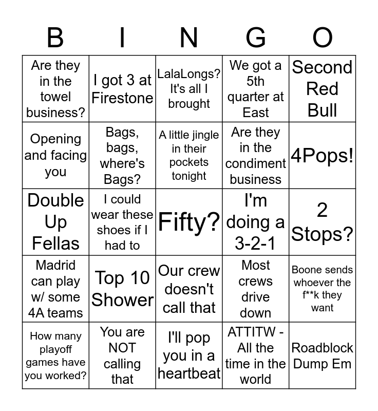This bingo card has a free space and 24 words: Top 10 Shower, You are NOT calling that, A little jingle in their pockets tonight, How many playoff games have you worked?, Second Red Bull, Are they in the towel business?, Opening and facing you, I got 3 at Firestone, I'm doing a 3-2-1, Our crew doesn't call that, Are they in the condiment business, Double Up Fellas, Most crews drive down, Boone sends whoever the f**k they want, Bags, bags, where's Bags?, ATTITW - All the time in the world, 2 Stops?, LalaLongs? It's all I brought, 4Pops!, I could wear these shoes if I had to, Roadblock Dump Em, Madrid can play w/ some 4A teams, We got a 5th quarter at East and I'll pop you in a heartbeat.