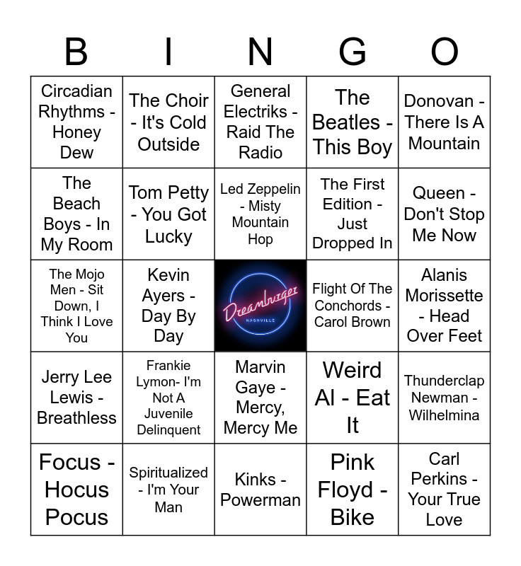 This bingo card has a free space and 30 words: Spiritualized - I'm Your Man, Abba - Mamma Mia, Kevin Ayers - Day By Day, Beach House - Lemon Glow, Circadian Rhythms - Honey Dew, General Electriks - Raid The Radio, Tom Petty - You Got Lucky, Marvin Gaye - Mercy, Mercy Me, Flight Of The Conchords - Carol Brown, Kinks - Powerman, Alanis Morissette - Head Over Feet, Carl Perkins - Your True Love, Pink Floyd - Bike, Pixies - Digging For Fire, Queen - Don't Stop Me Now, Adam & The Ants - Stand And Deliver, Weird Al - Eat It, Jerry Lee Lewis - Breathless, Frankie Lymon- I'm Not A Juvenile Delinquent, Donovan - There Is A Mountain, The Mojo Men - Sit Down, I Think I Love You, Gilbert O'Sullivan - Alone Again (Naturally), The Choir - It's Cold Outside, The First Edition - Just Dropped In, The Beach Boys - In My Room, The Beatles - This Boy, Thunderclap Newman - Wilhelmina, Focus - Hocus Pocus, Led Zeppelin - Misty Mountain Hop and Sweet - Ballroom Blitz.
