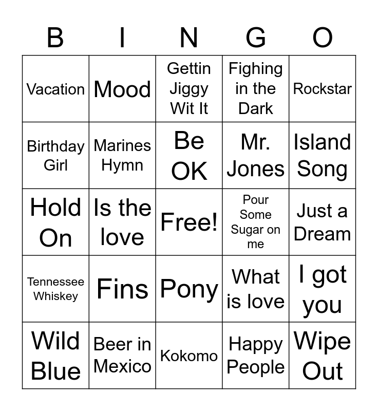 This bingo card has a free space and 24 words: Fins, Beer in Mexico, Be OK, Wild Blue, Rockstar, Vacation, Birthday Girl, Mood, Pour Some Sugar on me, Pony, Mr. Jones, Hold On, What is love, I got you, Marines Hymn, Happy People, Just a Dream, Gettin Jiggy Wit It, Island Song, Is the love, Wipe Out, Tennessee Whiskey, Fighing in the Dark and Kokomo.