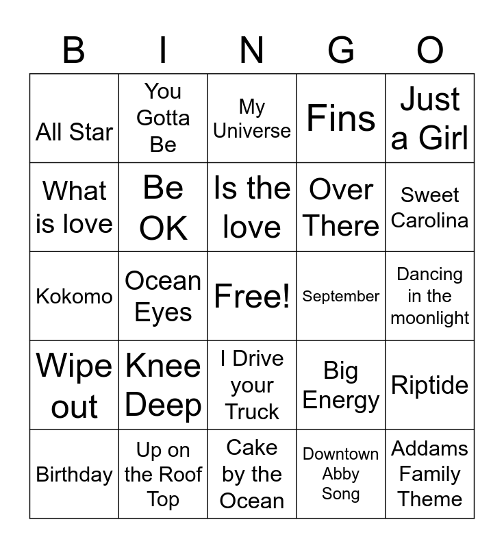 This bingo card has a free space and 24 words: Knee Deep, Up on the Roof Top, Is the love, Birthday, Just a Girl, All Star, What is love, You Gotta Be, September, I Drive your Truck, Over There, Kokomo, Big Energy, Riptide, Be OK, Downtown Abby Song, Dancing in the moonlight, My Universe, Sweet Carolina, Ocean Eyes, Addams Family Theme, Wipe out, Fins and Cake by the Ocean.