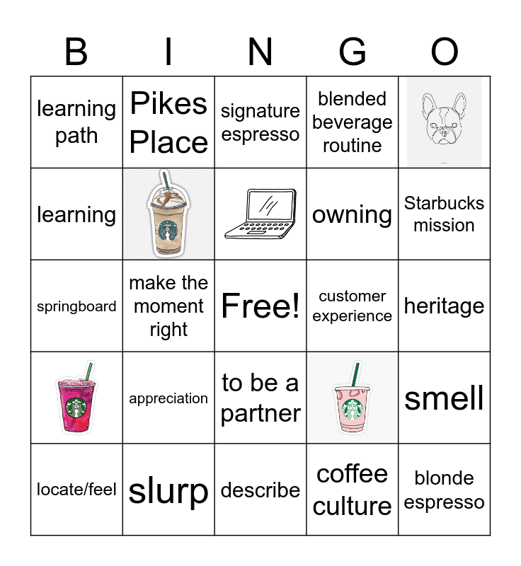 This bingo card has 9 images, a free space and 27 words: bar routine, make the moment right, blended beverage routine, be the light of the community, customer experience, Starbucks mission, learning path, Howard, appreciation, blonde espresso, signature espresso, heritage, smell, slurp, locate/feel, describe, Pikes Place, springboard, commitment, owning, learning, advising, pod, coffee culture, to be a partner, craft and connect and barista approach.