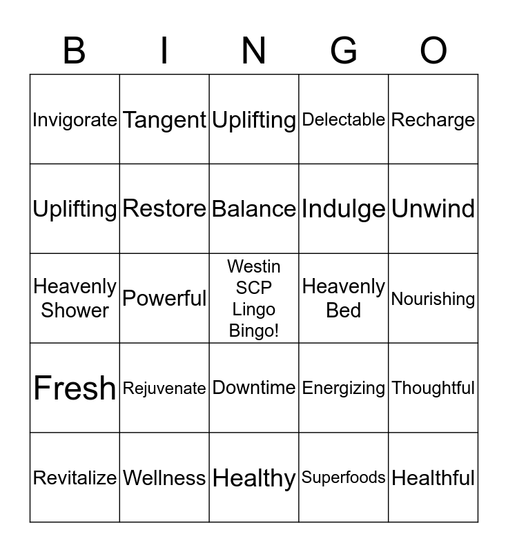 This bingo card has a free space and 24 words: Rejuvenate, Wellness, Balance, Revitalize, Recharge, Invigorate, Uplifting, Tangent, Heavenly Bed, Downtime, Indulge, Heavenly Shower, Energizing, Thoughtful, Restore, Superfoods, Nourishing, Uplifting, Unwind, Powerful, Healthful, Fresh, Delectable and Healthy.