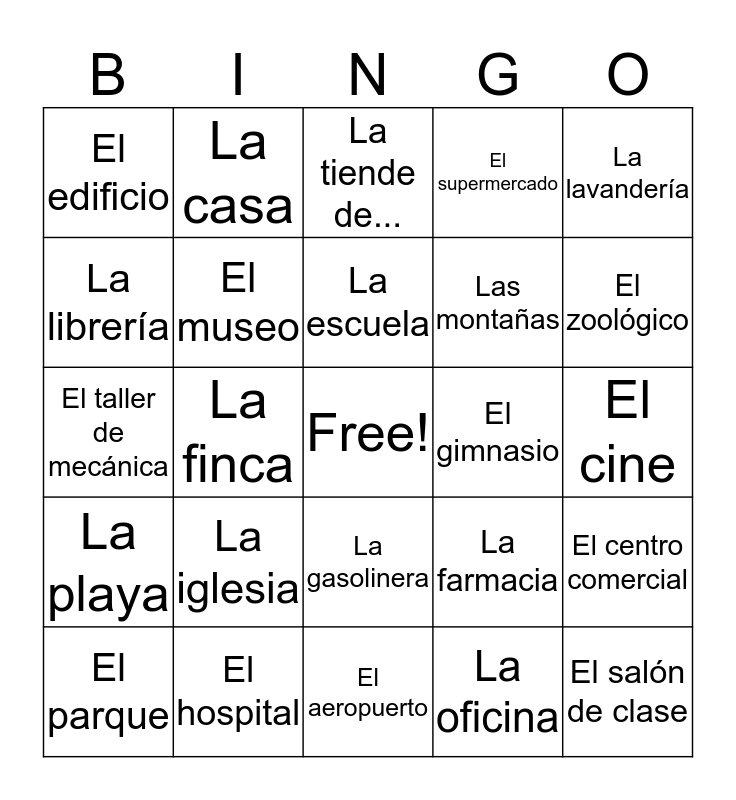 This bingo card has a free space and 24 words: La iglesia, El hospital, La escuela, El parque, La lavandería, El edificio, La librería, La casa, El gimnasio, La gasolinera, Las montañas, El taller de mecánica, La farmacia, El centro comercial, El museo, La oficina, El cine, La tiende de..., El zoológico, La finca, El salón de clase, La playa, El supermercado and El aeropuerto.