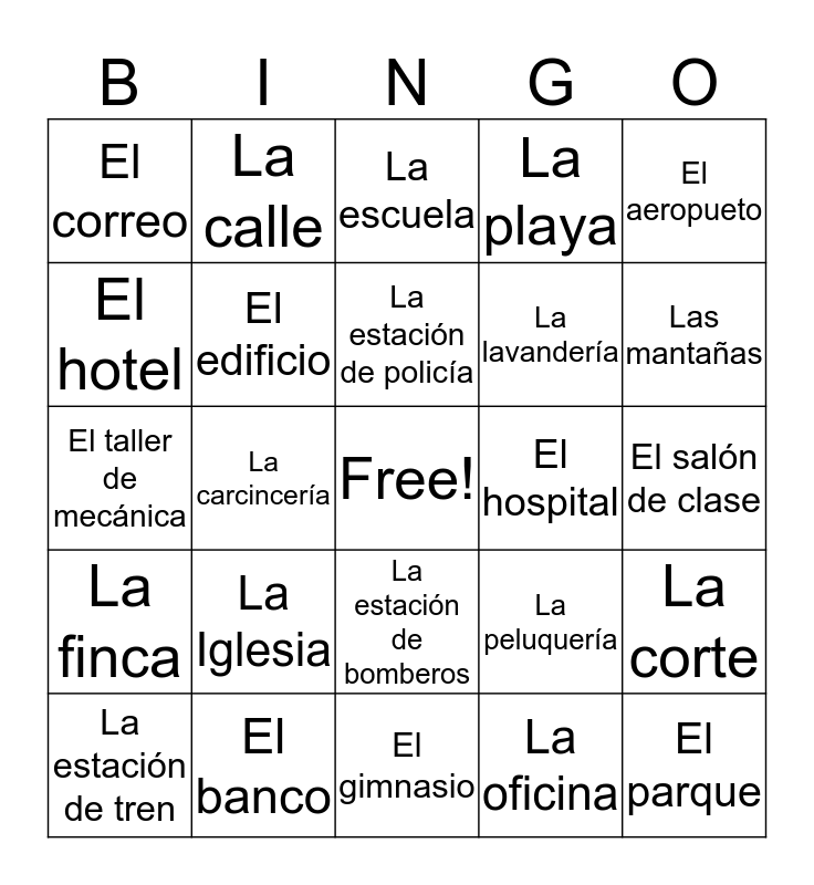 This bingo card has a free space and 24 words: La Iglesia, El banco, La estación de policía, La estación de tren, El aeropueto, El correo, El hotel, La calle, El hospital, La estación de bomberos, La lavandería, El taller de mecánica, La peluquería, La corte, El edificio, La oficina, El salón de clase, La escuela, Las mantañas, La carcincería, El parque, La finca, La playa and El gimnasio.