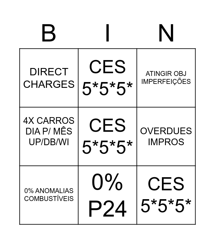 This bingo card has a free space and 8 words: OVERDUES IMPROS, ATINGIR OBJ IMPERFEIÇÕES, CES 5*5*5*, 0% ANOMALIAS COMBUSTÍVEIS, DIRECT CHARGES, CES 5*5*5*, 4X CARROS DIA P/ MÊS UP/DB/WI and 0% P24.