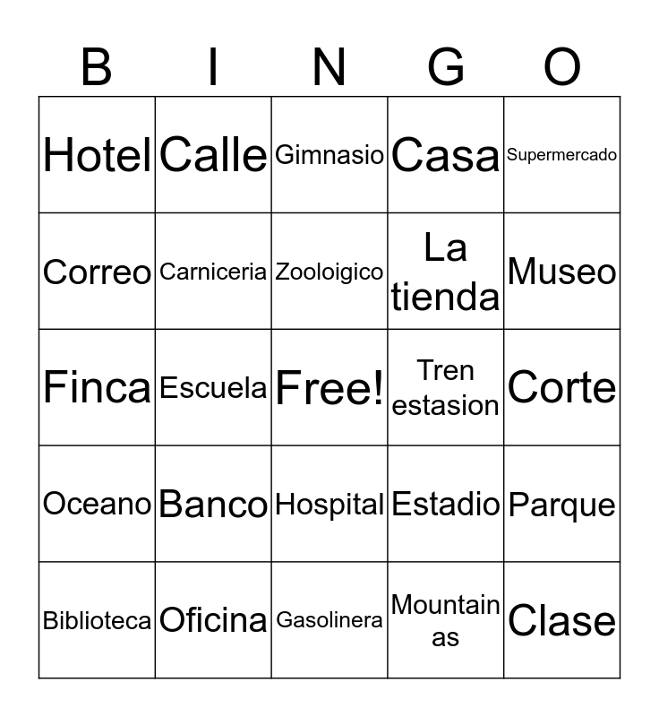 This bingo card has a free space and 24 words: Banco, Oficina, Zooloigico, Biblioteca, Supermercado, Hotel, Correo, Calle, Tren estasion, Hospital, La tienda, Finca, Estadio, Parque, Carniceria, Mountain as, Corte, Gimnasio, Museo, Escuela, Clase, Oceano, Casa and Gasolinera.