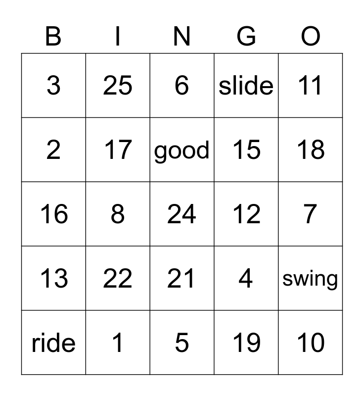 This bingo card has 30 words: 1, 14, 8, 23, 3, 6, 17, 21, 12, 5, 7, 24, 19, 10, 18, 20, 4, 13, 22, 11, 16, 9, 25, 15, 2, slide, swing, ride, good and friend.