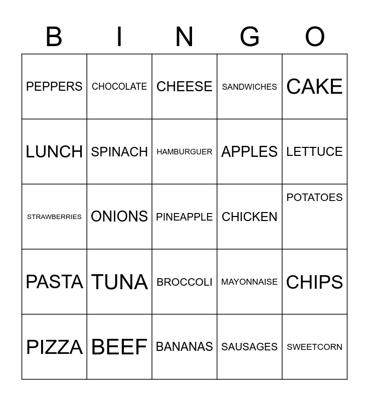 This bingo card has a free space and 29 words: PIZZA, OLIVES, ONIONS, TOMATOES, PEPPERS, CHEESE, SPINACH, TUNA, CHICKEN, BEEF, POTATOES, SWEETCORN, BANANAS, SAUSAGES, LETTUCE, CARROTS, BROCCOLI, PASTA, CAKE, STRAWBERRIES, MAYONNAISE, KETCHUP, APPLES, LUNCH, SANDWICHES, CHOCOLATE, CHIPS, HAMBURGUER and ORANGES.