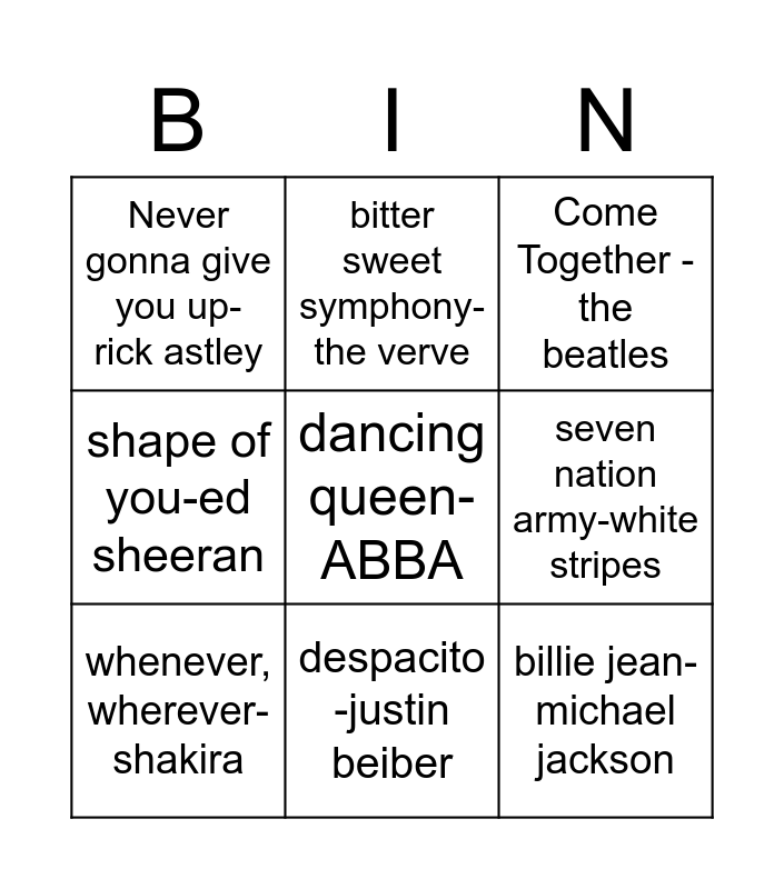 This bingo card has 20 words: sweet caroline- neil diamond, I'm a believer-the monkees, Come Together -the beatles, bohemian rapsody-queen, livin' on a prayer-Bon Jovi, dancing queen-ABBA, wonderwall-oasis, Never gonna give you up- rick astley, billie jean- michael jackson, bitter sweet symphony-the verve, barbie girl -aqua, YMCA-village people, seven nation army-white stripes, escape-rupert holmes, whenever, wherever- shakira, toxic- brittany spears, despacito -justin beiber, shape of you-ed sheeran, dynamite -BTS and karma chameleon-culture club.