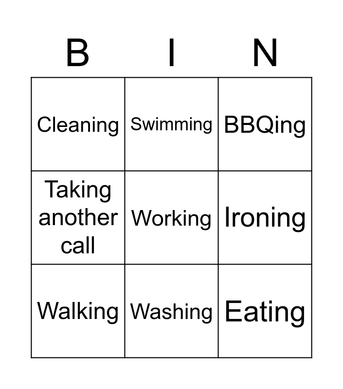 This bingo card has a free space and 8 words: Ironing, BBQing, Swimming, Walking, Cleaning, Eating, Taking another call and Washing.