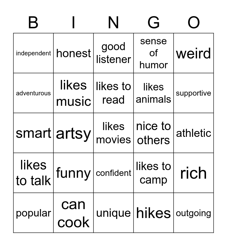 This bingo card has 25 words: funny, unique, likes to read, popular, weird, independent, adventurous, honest, nice to others, confident, likes animals, smart, likes to camp, rich, likes music, outgoing, athletic, good listener, supportive, artsy, likes movies, can cook, likes to talk, sense of humor and hikes.