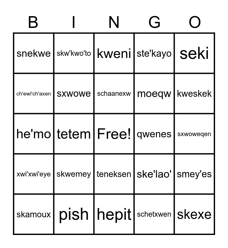 This bingo card has a free space and 24 words: skwemey, pish, schaanexw, skamoux, seki, snekwe, ch'ewi'ch'axen, skw'kwo'to, qwenes, teneksen, moeqw, he'mo, ske'lao', smey'es, sxwowe, schetxwen, sxwoweqen, kweni, kweskek, tetem, skexe, xwi'xwi'eye, ste'kayo and hepit.