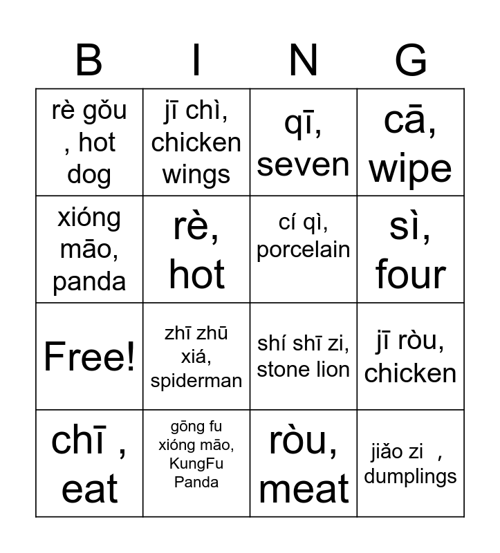 This bingo card has 20 words: jī ròu, chicken, qiū tiān, fall season, qī, seven, xǐ huān, like, chī , eat, xióng māo, panda, gōng fu xióng māo, KungFu Panda, rè gǒu , hot dog, Free!, jī chì, chicken wings, zhī zhū xiá, spiderman, shí shī zi, stone lion, rè, hot, jiǎo zi , dumplings, cí qì, porcelain, sǐ, death, sì, four, cā, wipe, ròu, meat and jiān jiǎo zi , fried dumplings.