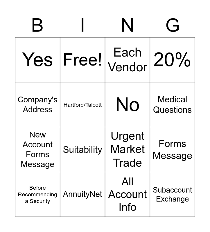 This bingo card has 16 words: AnnuityNet, Forms Message, Each Vendor, Yes, New Account Forms Message, Free!, Urgent Market Trade, All Account Info, Company's Address, Hartford/Talcott, Before Recommending a Security, 20%, Suitability, Medical Questions, No and Subaccount Exchange.