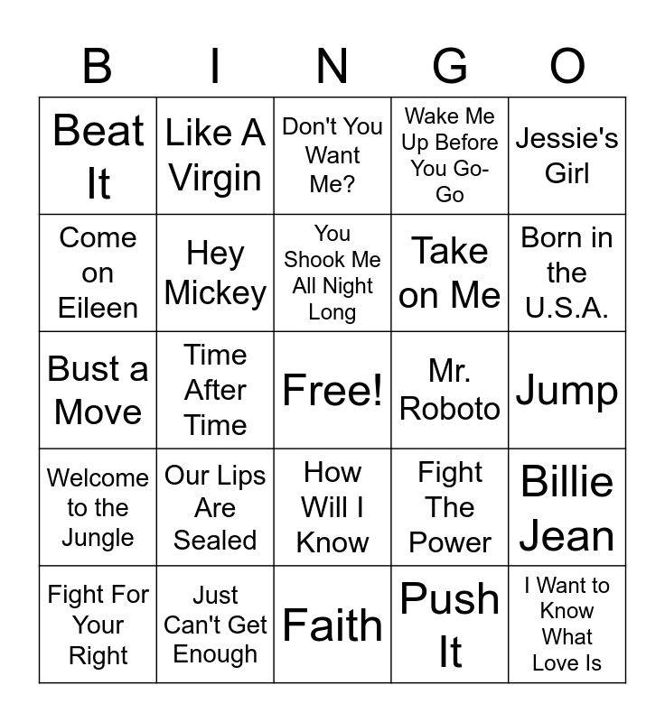 This bingo card has a free space and 64 words: Livin' On A Prayer, Pour Some Sugar on Me, Hungry Like the Wolf, Billie Jean, When Doves Cry, Sweet Child O' Mine, Like A Virgin, Walk This Way, You Shook Me All Night Long, Don't Stop Believing, How Will I Know, Running Up That Hill, Jump, Jessie's Girl, Here I Go Again, Come on Eileen, Time After Time, Beat It, Girls Just Want to Have Fun, Take on Me, Our Lips Are Sealed, Welcome to the Jungle, Wake Me Up Before You Go-Go, Love Is a Battlefield, Under Pressure, Tainted Love, Every Rose Has Its Thorn, In The Air Tonight, Janie's Got a Gun, Love Shack, London Calling, Nasty, Every Breath You Take, We're Not Gonna Take It, Born in the U.S.A., Fight For Your Right, Sweet Dreams (Are Made of This), Push It, Total Eclipse of the Heart, Hey Mickey, Bust a Move, Mr. Roboto, Take My Breath Away, Whip It, Straight Up, I Want to Know What Love Is, Just Can't Get Enough, Keep on Loving You, Fight The Power, I Love Rock N' Roll, Super Freak, 99 Luftballoons, Faith, Little Red Corvette, Candy Girl, Call Me, Don't You Want Me?, Walk Like An Egyptian, It Takes Two, Kiss, I Want Candy, Ain't Nobody, My Prerogative and What I Like About You.