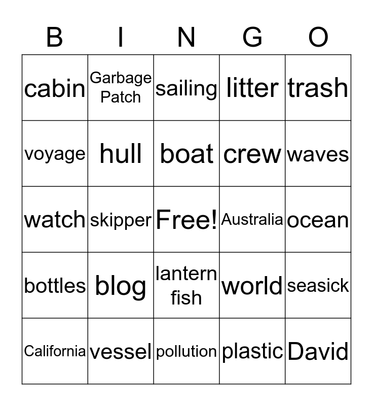 This bingo card has a free space and 24 words: blog, vessel, boat, California, trash, cabin, voyage, Garbage Patch, Australia, lantern fish, crew, watch, world, seasick, hull, plastic, ocean, sailing, waves, skipper, David, bottles, litter and pollution.