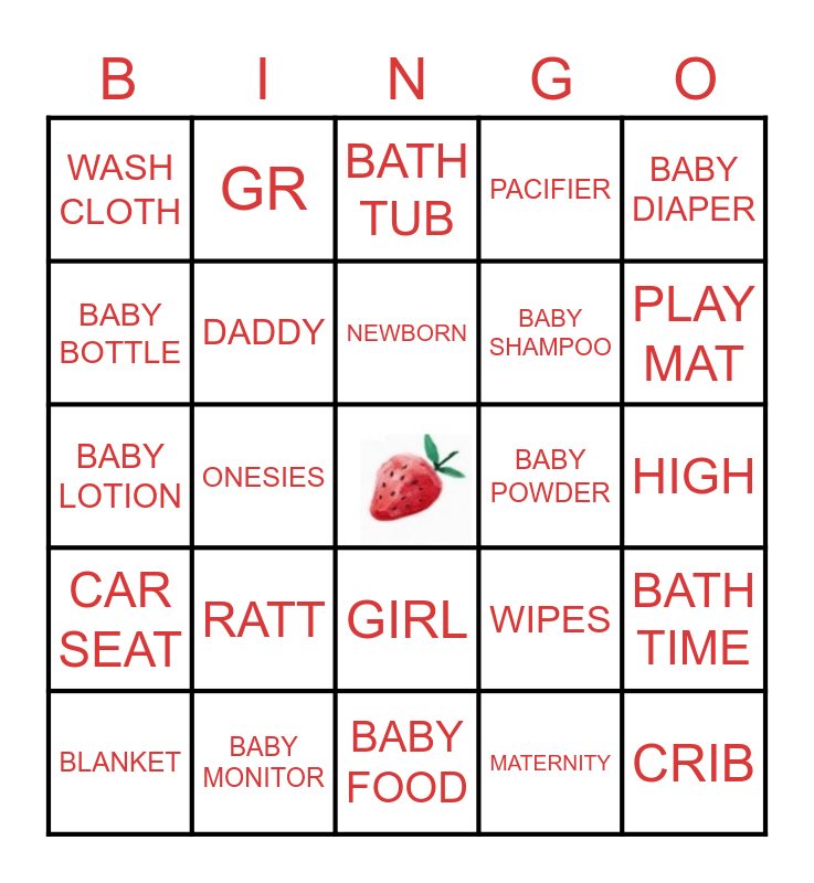 This bingo card has a free space and 35 words: BABY, VIOLET, MOMMY, DADDY, GIRL, PACIFIER, BABY BOTTLE, BABY FORMULA, NEWBORN, TEETHER, BABY LOTION, BABY DIAPER, SIPPY CUP, BURP CLOTH, WASH CLOTH, BABY POWDER, MATERNITY, ONESIES, CAR SEAT, CRIB, WIPES, BLANKET, BATH TIME, BABY MONITOR, BATH TUB, PLAY MAT, TUMMY TIME, BIB, BABY SHAMPOO, HIGH, CARRIER, BABY FOOD, RATT, GR and CUDD.