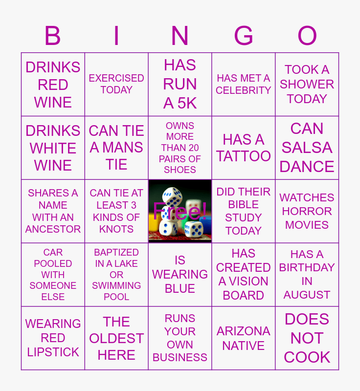 This bingo card has a free space and 54 words: WORE BINGO THEMED ATTIRE, CAR POOLED WITH SOMEONE ELSE, IS A VEGETARIAN, KNOWS MORE THAN ONE LANGUAGE, IS WEARING BLUE, LEFT HANDED, HAS MET A CELEBRITY, HAS MORE THAN 2 PETS, DRINKS WHITE WINE, PLAYS AN INSTRUMENT, DRINKS RED WINE, THE YOUNGEST HERE, THE OLDEST HERE, WEARING RED LIPSTICK, DOESN'T HAVE FACEBOOK, RUNS YOUR OWN BUSINESS, DOES NOT COOK, HAS A TATTOO, GOES TO BED BY 9PM, WATCHES HORROR MOVIES, HAS CREATED A VISION BOARD, LISTENS TO COUNTRY MUSIC, DID THEIR BIBLE STUDY TODAY, TOOK A SHOWER TODAY, PRAYED TODAY, EXERCISED TODAY, DRINKS WATER ALL DAY, JOURNALS, WEARS CONTACTS, ARIZONA NATIVE, CAN CHANGE A TIRE, WEARING PINK NAIL POLISH, SHOE SIZE IS 9 OR BIGGER, HAS RED HAIR, HAS RUN A 5K, HAS BEEN ON A CRUISE SHIP, SHARES A NAME WITH AN ANCESTOR, HAS A BIRTHDAY IN AUGUST, STILL HAS STUFFED ANIMALS, CAN TIE A MANS TIE, CAN STILL DO A CART WHEEL, HAS BROKEN A BONE, HAS NEVER BROKEN A BONE, HAS MORE THAN 1000 INSTAGRAM FOLLOWERS, BAPTIZED IN A LAKE OR SWIMMING POOL, HAS FALLEN ASLEEP DURING A CHURCH SERVICE, HAS PURPOSLY EATEN BUGS, KNOWS HOW TO DRIVE A MOTORCYCLE, OWNS MORE THAN 20 PAIRS OF SHOES, CAN TIE AT LEAST 3 KINDS OF KNOTS, CAN SALSA DANCE, STILL AFRAID OF THE DARK, YOU ARE WEARING EARRINGS and PREFERS COKE OVER PEPSI.