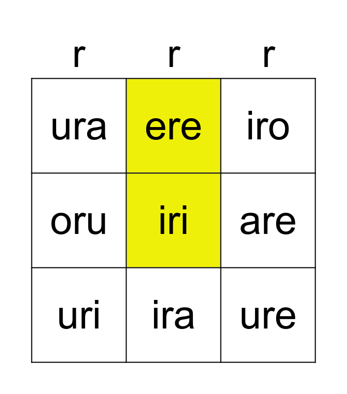 This bingo card has 25 words: ara, era, ira, ora, iri, ura, are, ere, ire, ore, ure, ari, eri, ori, uri, aro, ero, iro, oro, uro, aru, eru, iru, oru and uru.