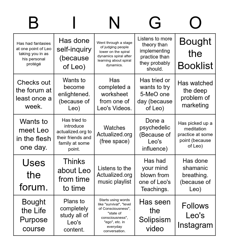 This bingo card has a free space and 24 words: Thinks about Leo from time to time, Plans to completely study all of Leo's content., Has completed a worksheet from one of Leo's Videos., Bought the Life Purpose course, Bought the Booklist, Has had fantasies at one point of Leo taking you in as his personal protégé, Checks out the forum at least once a week., Has done self-inquiry (because of Leo), Done a psychedelic (Because of Leo's influence), Listens to the Actualized.org music playlist, Has tried or wants to try 5-MeO one day (because of Leo), Wants to meet Leo in the flesh one day., Has had your mind blown from one of Leo's Teachings., Has done shamanic breathing. (because of Leo), Wants to become enlightened. (because of Leo), Has seen the Solipsism video, Has picked up a meditation practice at some point (because of Leo), Went through a stage of judging people lower on the spiral dynamics spiral after learning about spiral dynamics., Has watched the deep problem of marketing, Has tried to introduce actualized.org to their friends and family at some point., Follows Leo's Instagram, Uses the forum., Listens to more theory than implementing practice than they probably should. and Starts using words like "survival", "level of Consciousness", "state of consciousness", "ego", etc. in everyday conversation..