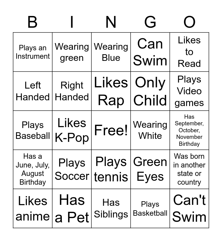 This bingo card has a free space and 25 words: Has a June, July, August Birthday, Has a Pet, Has Siblings, Plays Basketball, Likes to Read, Plays an Instrument, Wearing green, Wearing Blue, Wearing White, Was born in another state or country, Left Handed, Right Handed, Brown Eyes, Green Eyes, Plays Video games, Likes anime, Likes K-Pop, Likes Rap, Only Child, Has September, October, November Birthday, Plays Baseball, Plays Soccer, Plays tennis, Can Swim and Can't Swim.