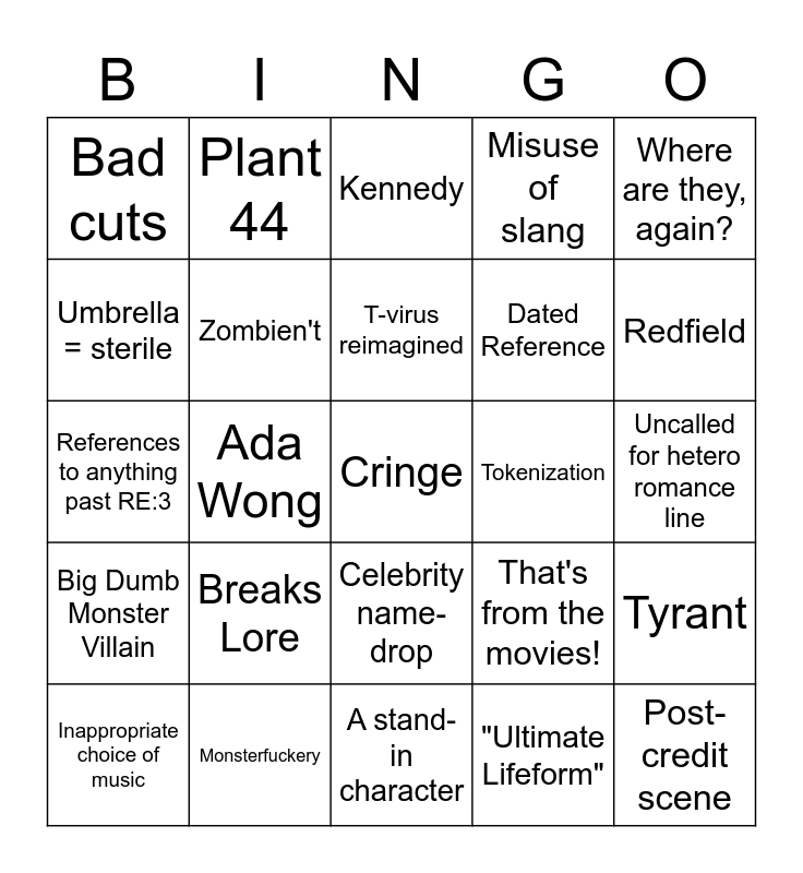 This bingo card has a free space and 25 words: Breaks Lore, A stand-in character, T-virus reimagined, Inappropriate choice of music, Where are they, again?, Bad cuts, Umbrella = sterile, Plant 44, Tokenization, Celebrity name-drop, Dated Reference, References to anything past RE:3, That's from the movies!, Tyrant, Zombien't, Main character gets infected, Uncalled for hetero romance line, Kennedy, Redfield, Ada Wong, Post-credit scene, Monsterfuckery, Big Dumb Monster Villain, Misuse of slang and "Ultimate Lifeform".
