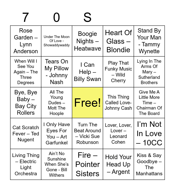 This bingo card has a free space and 90 words: Mississippi - Pussycat, Staying Alive – Bee Gees, Turn The Beat Around – Vicki Sue Robunson, Jolene – Dolly Parton, Kissing In The Back Row – The Drifters, January - Pilot, Rock On – David Essex, If You Don’t Know Me By Now – Harold Melvin, Wayward Son – Kansas, Take On All The World –Judas Priest, Don’t Stop – Fleetwood Mac, Bridge Over Troubled Water – Simon & Garfunkel, No Regrets – The Walker Brothers, Give Me A Little More Time – Chairman Of The Board, Yes Sir I Can Boogie - Baccara, I Can Help – Billy Swan, Starship Trooper – Hot Gossip, Because The Night – Patti Smith, Girls, Girls, Girls – Sailor, All By Myself – Eric Carmen, I Love To Love – Tina Charles, Baby Don’t Get Hooked On Me – Mac Davis, Fire – Pointer Sisters, Me & Mrs Jones – Billy Paul, Bye, Bye Baby – Bay City Rollers, Ain’t No Sunshine When She’s Gone - Bill Withers, Love Train – The O’Jays, American Woman – The Guess Who, Boogie Oogie Woogie – A Taste Of Honey, Love Really Hurts Without You – Billy Ocean, There Goes Another Love Song – The Outlaws, I’m Not In Love – 10CC, Tie A Yellow Ribbon – Dawn ft Tony Orlando, Cat Scratch Fever – Ted Nugent, Rose Garden – Lynn Anderson, Heart Of Glass – Blondie, Boogie Nights – Heatwave, I’m A California Man – Cheap Trick, All The Young Dudes – Mott The Hoople, Lying In The Arms Of Mary – Sutherland Brothers, Living Thing – Electric Light Orchestra, When Will I See You Again – The Three Degrees, Brand New Key - Melanie, YMCA – Village People, Lady Marmalade - Patti Labelle, Lover, Lover, Lover – Leonard Cohen, Mandy – Barry Manilow, I’d Like To Teach The World To Sing – New Seekers, Roll Away The Stone - Mott The Hoople, Suicide Is Painless - The Ron Hicklin Singers, Without You – Harry Nilsson, Play That Funky Music – Wild Cherry, Instant Replay – Dan Hartman, Gonna Make You A Star – David Essex, War - Edwin Starr, One Wat Ticket – Eruption, This Thing Called Love- Johnny Cash, The Most Beautiful Girl In The World – Charlie Rich, Family Affair – Sly & The Family Stone, Rock The Boat – Hues Corporation, Ring My Bell – Anita Ward, More Than A Feeling - Boston, Band Of Gold – Freda Payne, I’m In The Mood For Dancing – The Nolans, Sylvia’s Mother – Dr Hook, Best Of My Love – The Emotions, Midnight Train To Georgia – Gladys Knight, Hold Your Head Up – Argent, Every Day Hurts – Sad Café, Some Girls - Racey, I Only Have Eyes For You – Art Garfunkel, Kiss & Say Goodbye – The Manhattans, It Never Rains In Southern California – Albert Hammond, I Will Survive – Gloria Gaynor, Under The Moon Of Love - Showaddywaddy, Tears On My Pillow - Johnny Nash, Pearl’s A Singer – Elkie Brooks, It’s A Heartache – Bonnie Tyler, Ballroom Blitz - Sweet, Blame It On The Boogie – The Jackson 5, What Can I Say – Boz Scaggs, Stand By Your Man - Tammy Wynette, Silver Moon – Mike Nesmith, This Is It - Melba Moore, More, More, More – Andrea True Connection, Summer Breeze – The Isley Brothers, San Bernadino – Jeff Christie, Black Betty – Ram Jam, Cold As Ice - Foreigner and Too Much, Too Little, Too Late - Deniece Williams.