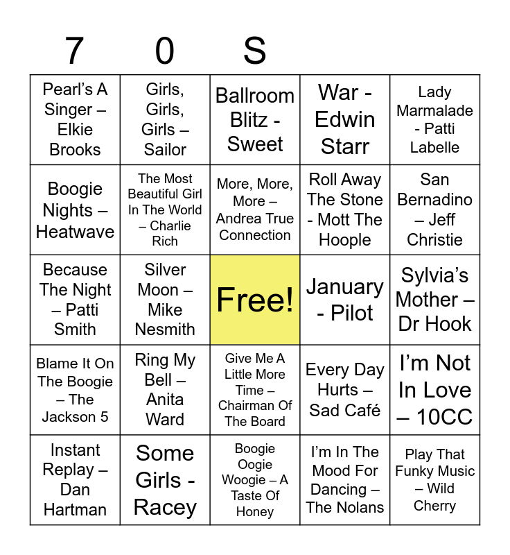 This bingo card has a free space and 90 words: Lover, Lover, Lover – Leonard Cohen, Tears On My Pillow - Johnny Nash, Give Me A Little More Time – Chairman Of The Board, Bridge Over Troubled Water – Simon & Garfunkel, This Thing Called Love- Johnny Cash, Black Betty – Ram Jam, Take On All The World –Judas Priest, One Wat Ticket – Eruption, YMCA – Village People, Brand New Key - Melanie, Best Of My Love – The Emotions, No Regrets – The Walker Brothers, Hold Your Head Up – Argent, Sylvia’s Mother – Dr Hook, All By Myself – Eric Carmen, More, More, More – Andrea True Connection, Suicide Is Painless - The Ron Hicklin Singers, More Than A Feeling - Boston, I Only Have Eyes For You – Art Garfunkel, Yes Sir I Can Boogie - Baccara, Without You – Harry Nilsson, Too Much, Too Little, Too Late - Deniece Williams, Boogie Oogie Woogie – A Taste Of Honey, If You Don’t Know Me By Now – Harold Melvin, Because The Night – Patti Smith, Some Girls - Racey, Kissing In The Back Row – The Drifters, Under The Moon Of Love - Showaddywaddy, I Can Help – Billy Swan, Love Really Hurts Without You – Billy Ocean, Mississippi - Pussycat, I’m Not In Love – 10CC, Summer Breeze – The Isley Brothers, Blame It On The Boogie – The Jackson 5, Pearl’s A Singer – Elkie Brooks, War - Edwin Starr, Ballroom Blitz - Sweet, Band Of Gold – Freda Payne, Silver Moon – Mike Nesmith, San Bernadino – Jeff Christie, Instant Replay – Dan Hartman, Boogie Nights – Heatwave, I’d Like To Teach The World To Sing – New Seekers, Wayward Son – Kansas, Family Affair – Sly & The Family Stone, Every Day Hurts – Sad Café, It’s A Heartache – Bonnie Tyler, Staying Alive – Bee Gees, All The Young Dudes – Mott The Hoople, Rock The Boat – Hues Corporation, Kiss & Say Goodbye – The Manhattans, Roll Away The Stone - Mott The Hoople, Me & Mrs Jones – Billy Paul, Love Train – The O’Jays, Heart Of Glass – Blondie, Turn The Beat Around – Vicki Sue Robunson, January - Pilot, This Is It - Melba Moore, Starship Trooper – Hot Gossip, Lying In The Arms Of Mary – Sutherland Brothers, American Woman – The Guess Who, Don’t Stop – Fleetwood Mac, What Can I Say – Boz Scaggs, There Goes Another Love Song – The Outlaws, When Will I See You Again – The Three Degrees, Living Thing – Electric Light Orchestra, Tie A Yellow Ribbon – Dawn ft Tony Orlando, I’m In The Mood For Dancing – The Nolans, I Will Survive – Gloria Gaynor, Rock On – David Essex, Ring My Bell – Anita Ward, Play That Funky Music – Wild Cherry, Cold As Ice - Foreigner, I’m A California Man – Cheap Trick, Girls, Girls, Girls – Sailor, The Most Beautiful Girl In The World – Charlie Rich, Ain’t No Sunshine When She’s Gone - Bill Withers, Fire – Pointer Sisters, Midnight Train To Georgia – Gladys Knight, Gonna Make You A Star – David Essex, Jolene – Dolly Parton, Lady Marmalade - Patti Labelle, I Love To Love – Tina Charles, Rose Garden – Lynn Anderson, It Never Rains In Southern California – Albert Hammond, Baby Don’t Get Hooked On Me – Mac Davis, Stand By Your Man - Tammy Wynette, Bye, Bye Baby – Bay City Rollers, Mandy – Barry Manilow and Cat Scratch Fever – Ted Nugent.