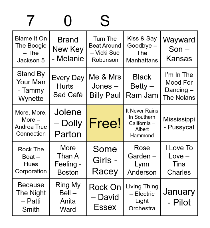 This bingo card has a free space and 90 words: Boogie Oogie Woogie – A Taste Of Honey, Suicide Is Painless - The Ron Hicklin Singers, Some Girls - Racey, Yes Sir I Can Boogie - Baccara, Instant Replay – Dan Hartman, Band Of Gold – Freda Payne, This Is It - Melba Moore, What Can I Say – Boz Scaggs, Roll Away The Stone - Mott The Hoople, All By Myself – Eric Carmen, Bridge Over Troubled Water – Simon & Garfunkel, There Goes Another Love Song – The Outlaws, The Most Beautiful Girl In The World – Charlie Rich, Mississippi - Pussycat, Heart Of Glass – Blondie, Me & Mrs Jones – Billy Paul, Cat Scratch Fever – Ted Nugent, Baby Don’t Get Hooked On Me – Mac Davis, Boogie Nights – Heatwave, Lying In The Arms Of Mary – Sutherland Brothers, Girls, Girls, Girls – Sailor, Cold As Ice - Foreigner, Rock On – David Essex, Don’t Stop – Fleetwood Mac, More, More, More – Andrea True Connection, Ring My Bell – Anita Ward, Love Really Hurts Without You – Billy Ocean, It’s A Heartache – Bonnie Tyler, I Will Survive – Gloria Gaynor, Ain’t No Sunshine When She’s Gone - Bill Withers, Love Train – The O’Jays, I Love To Love – Tina Charles, Summer Breeze – The Isley Brothers, Rock The Boat – Hues Corporation, Blame It On The Boogie – The Jackson 5, Kiss & Say Goodbye – The Manhattans, Turn The Beat Around – Vicki Sue Robunson, When Will I See You Again – The Three Degrees, Jolene – Dolly Parton, I’m In The Mood For Dancing – The Nolans, Because The Night – Patti Smith, Stand By Your Man - Tammy Wynette, Fire – Pointer Sisters, I Can Help – Billy Swan, I Only Have Eyes For You – Art Garfunkel, Rose Garden – Lynn Anderson, Lover, Lover, Lover – Leonard Cohen, Give Me A Little More Time – Chairman Of The Board, Starship Trooper – Hot Gossip, Too Much, Too Little, Too Late - Deniece Williams, YMCA – Village People, Black Betty – Ram Jam, One Wat Ticket – Eruption, Best Of My Love – The Emotions, Silver Moon – Mike Nesmith, I’d Like To Teach The World To Sing – New Seekers, It Never Rains In Southern California – Albert Hammond, Ballroom Blitz - Sweet, Hold Your Head Up – Argent, Mandy – Barry Manilow, No Regrets – The Walker Brothers, Under The Moon Of Love - Showaddywaddy, All The Young Dudes – Mott The Hoople, If You Don’t Know Me By Now – Harold Melvin, Tears On My Pillow - Johnny Nash, Midnight Train To Georgia – Gladys Knight, Sylvia’s Mother – Dr Hook, Living Thing – Electric Light Orchestra, Pearl’s A Singer – Elkie Brooks, I’m A California Man – Cheap Trick, More Than A Feeling - Boston, January - Pilot, I’m Not In Love – 10CC, Kissing In The Back Row – The Drifters, Brand New Key - Melanie, Every Day Hurts – Sad Café, Staying Alive – Bee Gees, Lady Marmalade - Patti Labelle, San Bernadino – Jeff Christie, Take On All The World –Judas Priest, Tie A Yellow Ribbon – Dawn ft Tony Orlando, Wayward Son – Kansas, American Woman – The Guess Who, Play That Funky Music – Wild Cherry, Bye, Bye Baby – Bay City Rollers, Family Affair – Sly & The Family Stone, Gonna Make You A Star – David Essex, This Thing Called Love- Johnny Cash, War - Edwin Starr and Without You – Harry Nilsson.