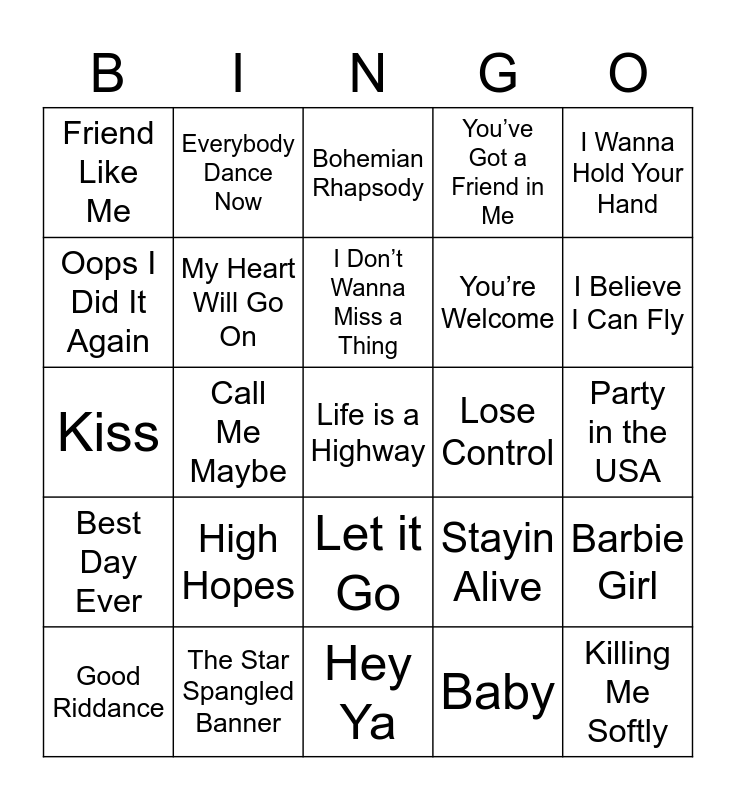 This bingo card has 80 words: Thriller, Living On a Prayer, Bohemian Rhapsody, All My Life, Sweet Caroline, Old Town Road, Bye Bye Bye, Single Ladies, A Whole New World, Part of The World, Can You Feel the Love Tonight, You’ll Be In My Heart, You’ve Got a Friend in Me, Friend Like Me, Colors of the Wind, Oops I Did It Again, Can’t Stop the Feelings, High Hopes, Shake it Off, Party in the USA, My Girl, I Wanna Hold Your Hand, Kiss, I Don’t Wanna Miss a Thing, My Heart Will Go On, I Will Always Love You, Natural Woman, RESPECT, Can’t Touch This, Ice Ice Baby, I Believe I Can Fly, This is How We Do It, Hey Ya, Killing Me Softly, Good Riddance, Lose Control, Still the One -Shania Twain, God Bless the Broken Road, Neon Moon, Life is a Highway, Superstition, Friends in Low Places, Jolene, Fancy, Cupid Shuffle, Everybody Dance Now, Cotton Eyed Joe, Whip and Nae Nae, Firework, Rolling in the Deep, Barbie Girl, Call Me Maybe, Stayin Alive, This is Me-Greatest Showman, Lovely Day, My Shot- Hamilton, Almost There- Princess and the Frog, Trashin’ the Camp, Into the Unknown, Let it Go, You’re Welcome, We Don’t Talk About Bruno, September, Girls Just Wanna Have Fun, True Colors, Never Gonna Give You Up, Landslide, I Wanna Dance With Somebody, Running Up that Hill- Kate Bush, Wannabe, Best Day Ever, The Star Spangled Banner, I’ve Got a Feeling, Moves Like Jagger, Jealous, American Woman, Baby, Since You’ve Been Gone, Happy and Cry Me A River.