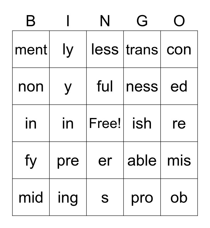 This bingo card has a free space and 24 words: pre, ing, ful, mid, con, ment, non, ly, ish, er, ness, in, able, mis, y, pro, re, less, ed, in, ob, fy, trans and s.