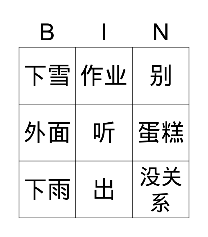 This bingo card has a free space and 8 words: 外面, 作业, 蛋糕, 下雨, 别, 下雪, 出 and 没关系.