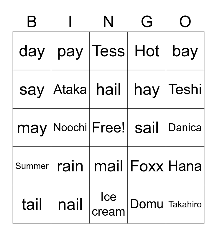 This bingo card has a free space and 24 words: rain, nail, hail, tail, bay, day, say, pay, sail, mail, hay, may, Foxx, Hana, Ataka, Domu, Danica, Tess, Teshi, Noochi, Takahiro, Summer, Hot and Ice cream.