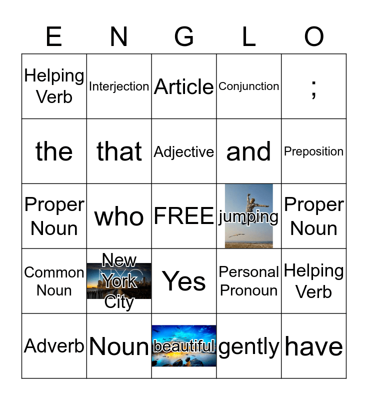This bingo card has 3 images, a free space and 24 words: New York City, Noun, Adjective, Adverb, ;, Helping Verb, the, Interjection, jumping, Yes, and, Proper Noun, Personal Pronoun, Helping Verb, that, gently, Proper Noun, Article, Preposition, who, have, Common Noun, Conjunction and beautiful.