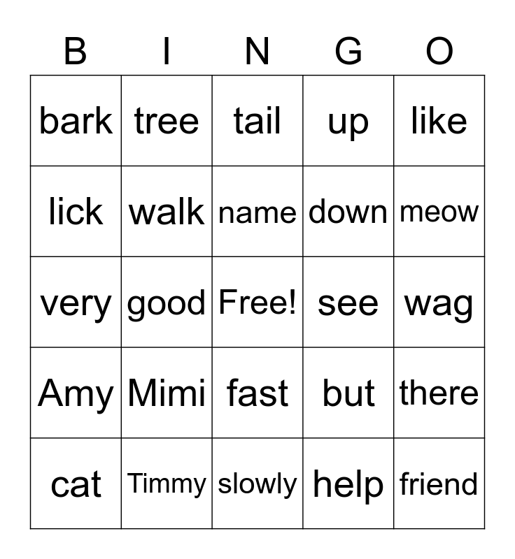 This bingo card has a free space and 24 words: Mimi, Timmy, name, cat, like, bark, lick, tree, see, fast, down, very, but, there, walk, help, wag, tail, meow, good, friend, Amy, up and slowly.