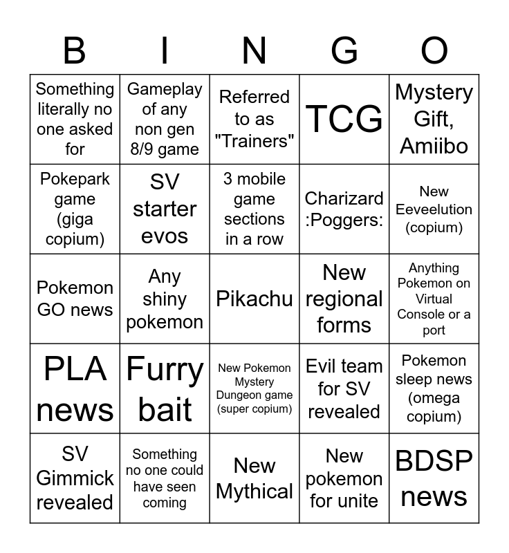 This bingo card has a free space and 24 words: Furry bait, Something no one could have seen coming, 3 mobile game sections in a row, SV Gimmick revealed, Mystery Gift, Amiibo, Something literally no one asked for, Pokepark game (giga copium), Gameplay of any non gen 8/9 game, New regional forms, New Pokemon Mystery Dungeon game (super copium), Charizard :Poggers:, Pokemon GO news, Evil team for SV revealed, Pokemon sleep news (omega copium), SV starter evos, New pokemon for unite, Anything Pokemon on Virtual Console or a port, Referred to as "Trainers", New Eeveelution (copium), Any shiny pokemon, BDSP news, PLA news, TCG and New Mythical.